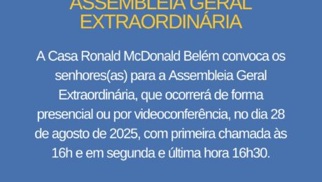 A Casa Ronald McDonald Belém convoca os senhores(as) para a Assembleia Geral Extraordinária, que ocorrerá de forma presencial ou por videoconferência, no dia 28 de agosto de 2025, com primeira chamada às 16h em segunda e última hora 16h30.
